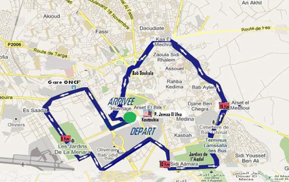 Les lignes de départ et d’arrivée sont situées sur l’avenue de MENARA. Le parcours vous permettra de courir le long des célèbres remparts de la ville. Mais aussi des arbres endémiques marocains avec des oliviers, dattiers et orangers.